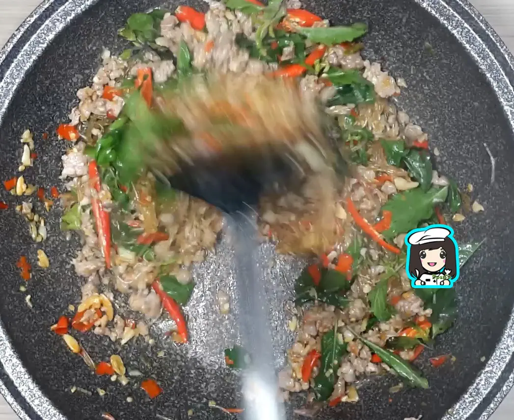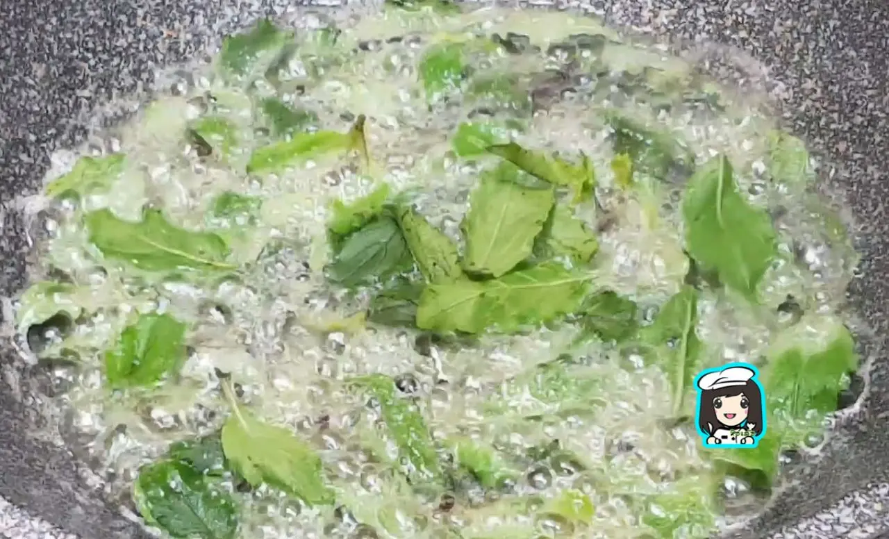 ใส่ใบกะเพราบ้างส่วนลงไปทอดให้กรอบไว้สำหรับโรยหน้า
