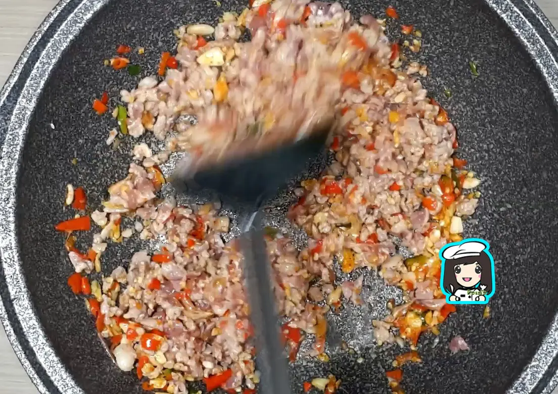 4.ตักน้ำมันในกระทะออกเหลือไว้ประมาณ 2 ชต.ใส่พริกกระเทียมลงไปผัดให้หอม ใส่หมูสับลงไปผัดคลุกกับพริกกระเทียม ยีให้เนื้อหมูกระจายออก