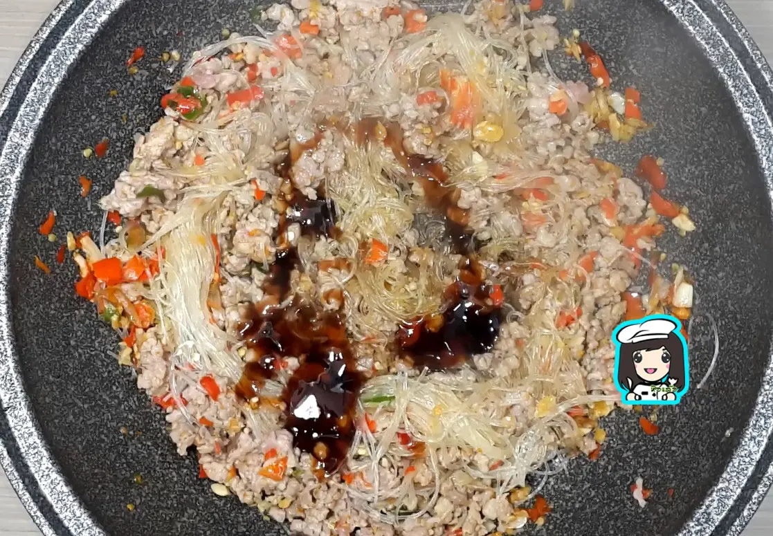 5.ใส่วุ้นเส้นที่แช่น้ำจนนิ่มแล้วลงไป เติมน้ำเปล่า(น้ำเปล่าใส่ในครกที่โขลกพริกกระเทียม) ลงไปเพื่อให้วุ้นเส้นนิ่มขึ้น ปรุงรสด้วยซอสฝาเขียว น้ำตาลทราย น้ำมันหอย ชิมรสตามชอบ