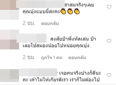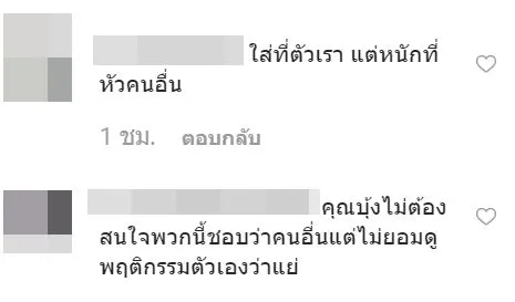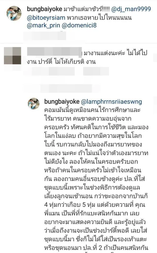 ซึ่งเจ้าตัวได้อธิบายแล้วว่าไปช่วงงาน After Party พอดีเลยไม่ได้แต่งตัวมาก ประกอบกับความรีบจะไปงานด้วย สาวบุ้งได้ออกมาตอกกลับชาวเน็ตคนนี้ โพสต์ภาพหน้าไอจีของชาวเน็ตที่มาป่วนในคอมเมนต์ กับรูปข้อความ พร้อมแคปชั่นอย่างเดือดว่า