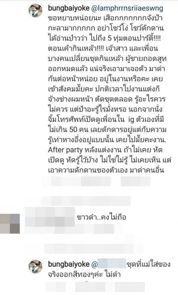 "“เอ๊า!!!! อยากมีเรื่องจัดให้ ใครนามสกุล ศรีแสวง ช่วยดูแลป้าลำพรรณ ศรีแสวง คนนี้หน่อย ป้ามาเที่ยวด่าคนอื่นใน ig เสร็จ ป้าปิด ig ไปเลย อุส่าส่งinbox จะไปสู้ส่วนตัวซะหน่อย ส่งไม่ได้ซะละ งั้นเอาลงให้ป้ามาเห็นเองดีกว่า ไม่รู้ ไม่อยู่ในเหตุการณ์ อย่าทำพฤติกรรมแบบนี้ ถ้าเจอคนจริง ขี้โมโหไปพูดไรเค้าแบบป้าอาจจะเจ็บตัวได้ คอมเม้นแรกคิดว่าป้าคงไม่รู้ อธิบายไปละ นี่มาอีกคอมเม้น ปกติเป็นคนมีมารยาทนะคะ แต่กับคนไม่มีมารยาทก็จะไม่มีมารยาทใส่ และด่ากลับ 5555555 นี้สืบเนื่องจากงานแต่งพี่ที่รักมาก แต่ช่วงพิธีการไปไม่ทันเพราะต้องพาพี่บุญเข้านอน กว่าจะปั๊มนมกล่อมนอน กินข้าวก็ปาเข้าไป 4 ทุ่ม ถึงงาน 5 ทุ่ม ก่อนออกจากบ้านโทรหาคนที่อยู่ในงานบอกว่า มาได้เลย อาฟเตอร์ปาร์ตี้แล้ว พิธีการจบแล้ว (เผื่อคนที่ไม่เคยรู้จัก After Party คือ เป็นงานฉลองแบบมีกินเหล้าดนตรี ทุกคนสนุกกันเต็มที่ เจ้าสาวเปลี่ยนชุด เพื่อนๆก็แต่งตัวตามสบาย คนที่อยากเต็มที่เต้นสนุกบางคนเอาชุดมาเปลี่ยน ผู้ชสยบางคนถอดสูท) เราก็รีบไปหลังลูกหลับ เพราะอยากไปแสดงความยินดี ไปถึงเจ้าบ่าวถอดสูทปาร์ตี้สนุกสนานเข้าไปเจ้าบ่าวดีใจเข้ามากอด เรายื่นซองให้เจ้าบอกยังบอกไม่เอาแค่มาพี่ก็ดีใจมากแล้ว สุดท้ายฝากลูกหลานช่วยสะกดชื่อภาษาอังกฤษให้ป้าหน่อย อ่านไม่ออกโว๊ยยยยยยยยยยย"