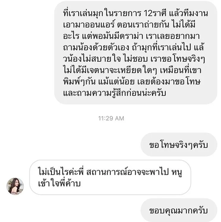 ล่าสุด ดีเจหล่ากุ้งโพสต์ลงไอจีว่า .."ก่อนอื่น ผมขอแจ้งว่าผมได้ติดต่อไปหาน้องโยชิ และได้ ขอโทษเป็นการส่วนตัวไปตั้งแต่เมื่อวานแล้วครับ น้องโยชิ ก็ตอบกลับตามที่เห็นนะครับ และได้มีการโทรคุยส่วนตัวเรียบร้อยครับ