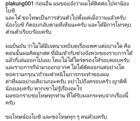 ขอความกรุณาถ้าจะตำหนิในการกระทำของผม ด่าที่ผมอย่างเดียวเถอะครับ อย่าไปถึงครอบครัว ญาติพี่น้องเลยครับ พวกเขาไม่รู้เรื่องอะไร ผมขอกราบขอโทษทุกท่าน ที่ได้รับผลกระทบจากเรื่องนี้ครับ ขอโทษน้องโยชิ และขอโทษทุก ๆ คนด้วยครับ