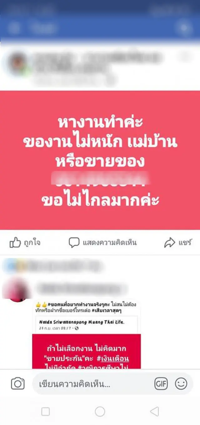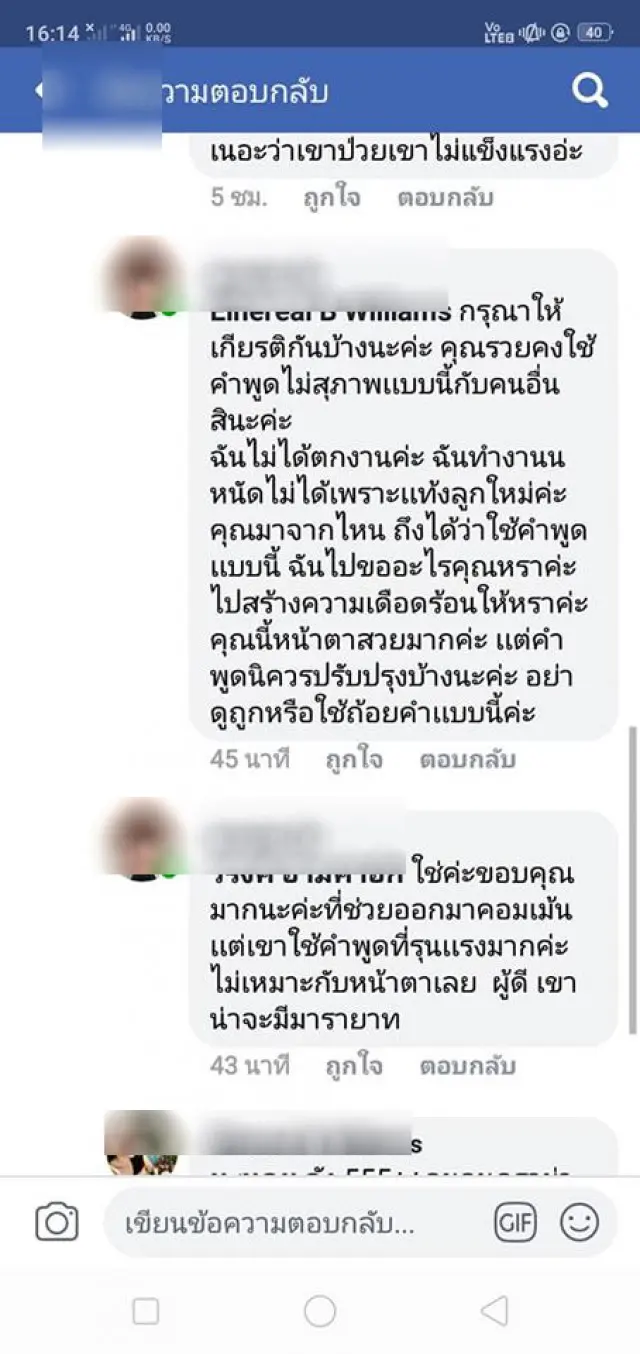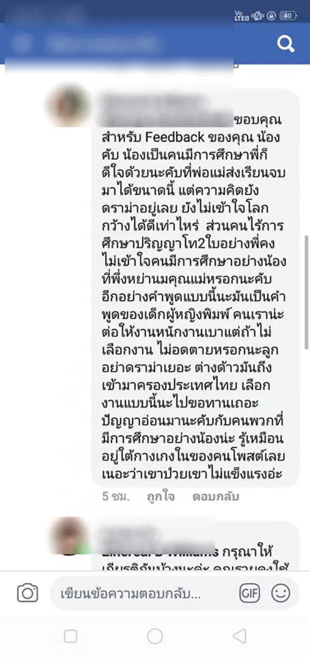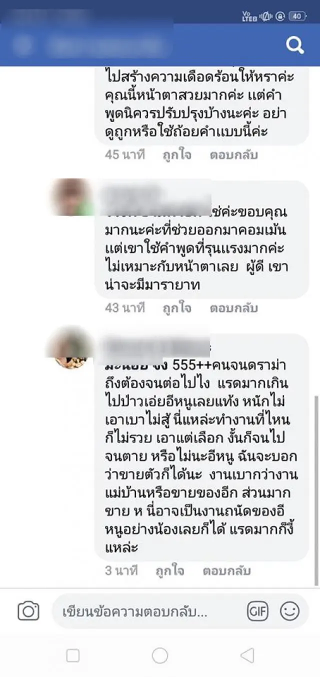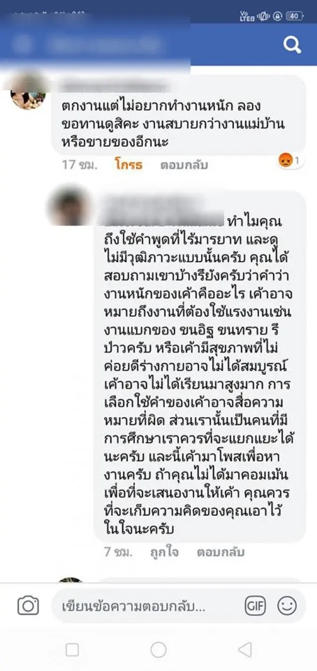 มีผู้ใช้เฟสบุ๊คท่านหนึ่งให้ฝากชื่อ และเบอร์โทรไว้จะติดต่อกลับ แต่ที่พีคสุดคือมีสาว ป.โท มาเม้นท์ให้เธอไปขอทาน ตกงานไม่อยากทำงานหนัก ลองขอทานดูสิคะ งานสบายกว่าแม่บ้านหรือขายของอีกนะ