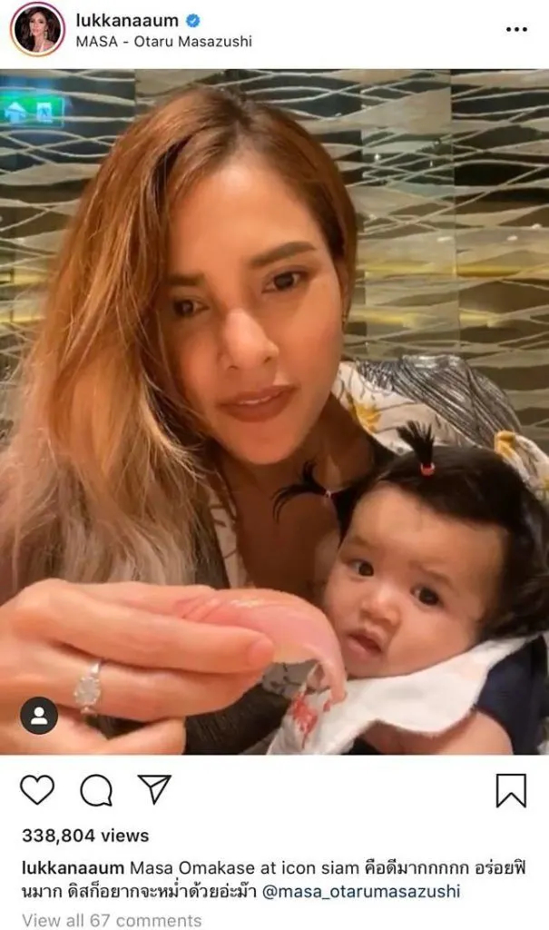 ล่าสุด ก็ดูเหมือนจะมีประเด็นเกิดขึ้นมาอีก เมื่อชาวเน็ตขุดไปเจอคลิปโป๊ะๆ สาวอุ้ม ระหว่างกำลังรับประทานอาหารญี่ปุ่น โดยใช้มือหยิบซูชิคำโตเข้าปาก ขณะที่มืออีกข้างกำลังอุ้ม น้องดิสนีย์ ตลอดจนให้นมลูกไปพร้อมๆ กัน ทำเอาชาวเน็ตเข้าไปวิพากษ์วิจารณ์ในคลิปดังกล่าวกันยกใหญ่ว่า ให้นมลูกแต่ทานปลาดิบ, ไม่กลัวมีเชื้อโรคหรือพยาธิเหรอ, เห็นว่ากลัวลูกจะติดเชื้อ แต่ก็ทานอาหารไม่ระวัง