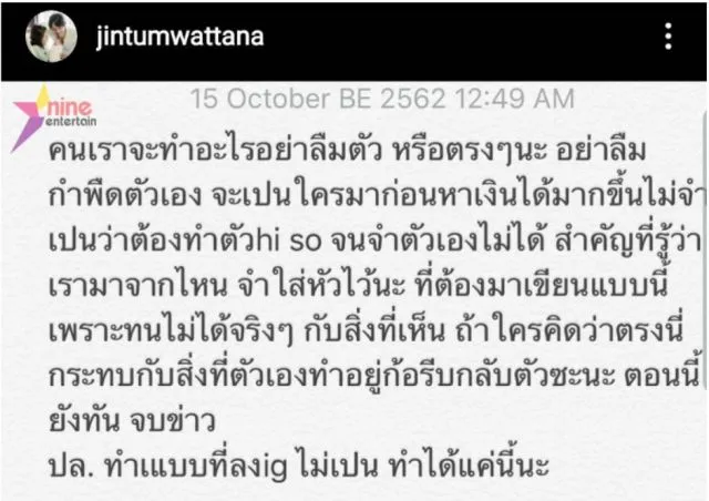 ถึงกับสะดุ้งกันเลยที่เดียวเมื่ออยู่สามีของสาว หนิง ปนิตา ก็เกิดอาการปริ๊ด เมื่ออยู่ๆ หนุ่ม จิน จรินทร์ ธรรมวัฒนะ สามีของหนิง ปณิตา ธรรมวัฒนะ ก็โพสต์ภาพข้อความระบุว่า คนเราจะทำอะไรอย่าลืมตัว หรือตรงๆ นะ อย่าลืมกำพืดตัวเอง จะเป็นใครมาก่อนหาเงินได้มากขึ้นไม่จำเป็นว่าต้องทำตัวhi so จนจำตัวเองไม่ได้ สำคัญที่รู้ว่าเรามาจากไหน จำใส่หัวไว้นะ ที่ต้องมาเขียนแบบนี้เพราะทนไม่ได้จริงๆ กับสิ่งที่เห็น ถ้าใครคิดว่าตรงนี่กระทบกับสิ่งที่ตัวเองทำอยู่ก็รีบกลับตัวชะนะ ตอนนี้ยังทัน จบข่าว ปล. ทำแบบที่ลงigไม่เป็น ทำได้แค่นี้นะ พร้อมกับแคปชั่นสั่นๆ ว่า แค่นั้นแหละ