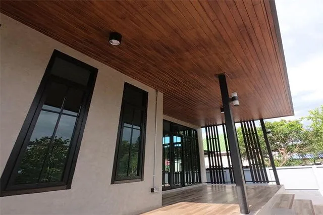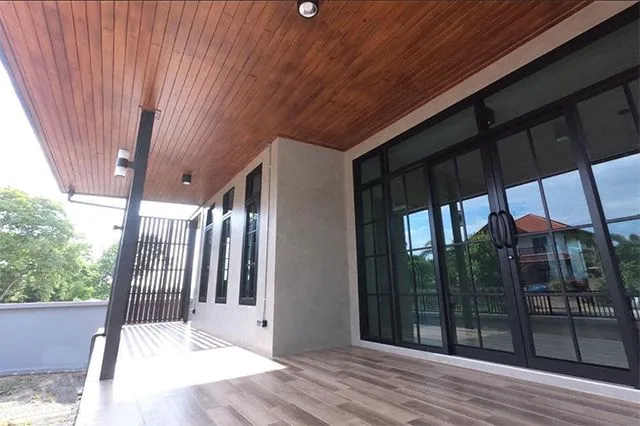 หน้าบ้าน ออกแบบให้มีพื้นระเบียงด้านนอก ปูด้วยกระเบื้องลายไม้ ให้ความรู้สึกที่เรียบง่าย บวกกับฝ้าเพดานที่ใช้เป็นแบบไม้โทนสีน้ำตาลด้วยแล้ว เรียกได้ว่าประยุกต์ความทันสมัย เข้ากับกลิ่นอายแบบธรรมชาติได้อย่างลงตัวเป็นอย่างยิ่ง