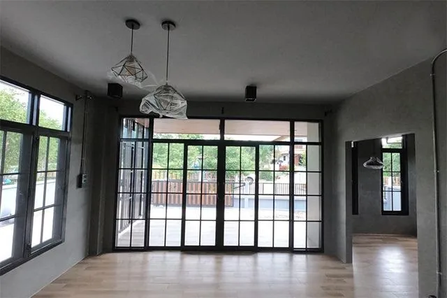 ประตูหน้าบ้านเป็นประตูกระจกแบบบานเลื่อน ที่นิยมใช้ในแบบบ้านสไตล์โมเดิร์นในทุกวันนี้ ที่นอกจากจะดูทันสมัยแล้ว ยังดูสวยงามลงตัวกับบ้านสไตล์นี้อย่างมาก และประตูติดด้วยฟิล์มสีเข้ม เพื่อเพิ่มความเป็นส่วนตัวของผู้พักอาศัย เสาที่ระเบียงเป็นเสาเหล็กสีดำ เพิ่มลูกเล่นด้วยโคมไฟ ทำให้น่าดูชมเป็นอย่างยิ่งครับ