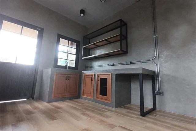 ห้องครัว ทำเป็นเคาน์เตอร์สำหรับ เตรียมอาหาร ทำอาหาร และมีที่สำหรับล้างจานอีกด้วย ด้านข้างติดตั้งชั้นวางลอย ที่ดูแล้วเข้ากันเป็นอย่างมากกับบ้านแนวนี้