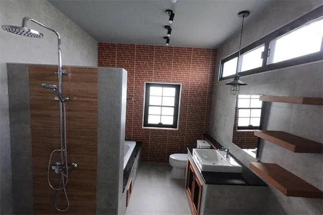ฝักบัว ที่ใช้เป็นแบบอะลูมิเนียมมันวาว บวกกับผนังห้องน้ำที่ตกแต่งแบบลอฟท์ ตัดกับลายอิฐมอญสีน้ำตาล ยิ่งทำให้บรรยากาศภายในห้องน้ำโดดเด่นเป็นอย่างมาก