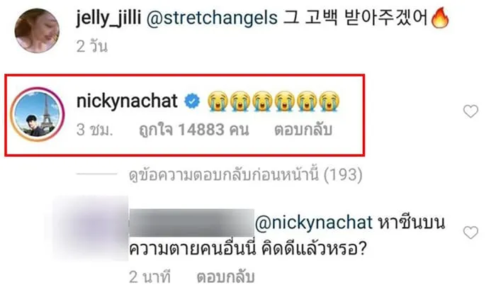 ล่าสุด ทางด้านของ หนุ่มนิกกี้ ได้เข้าไปโผล่คอมเม้นต์เพื่อแสดงความเสียใจถึงการจากไปของดาราสาวจากเกาหลี ซอลลี่ อดีตสมาชิกวง f(x) ที่ได้เสียชีวิตลง โดยการเข้าแสดงความคิดเห็นใต้รูปภาพด้วยอิโมจิร้องไห้ แต่กลับต้องโดนชาวเน็ตรุมด่าอย่างหนัก พร้อมกับโดนตั้งข้อสงสัย เสียใจจริงหรือจะเกาะกระแส รู้จักเขาหรอ ถึงเข้ามาเม้นต์?