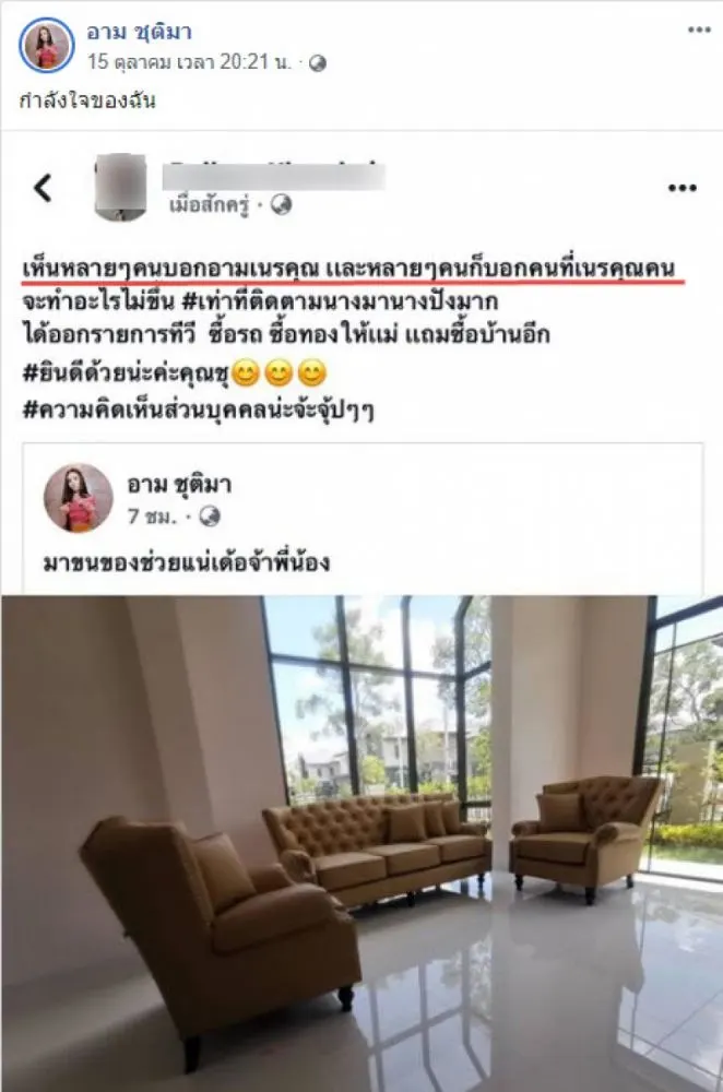 เรียกได้ว่าเป็นเรื่องราวที่มีคนแห่แสดงความยินดีกันเป็นจำนวนมาก เมื่ออาม ชุติมา ล่าสุดนี้โพสต์ภาพบ้านทุกมุมมองขอบคุณแฟนคลับพร้อมแคปชั่นว่า ขอบคุณ FC ขอบคุณแฟนเพลง ขอบคุณผู้ใหญ่ทุกท่านที่ให้โอกาส ขอบคุณทุกคนที่เมตตาเด็กคนนี้ ขอบคุณพ่อแม่ ขอบคุณพี่น้อง ขอบคุณเพื่อนร่วมงาน ขอบคุณพี่น้องศิลปินทุกท่าน ขอบคุณพี่น้องทุกคนที่ฟังเพลงหนูทุกคนคือส่วนหนึ่งของ อาม ชุติมาในวันนี้ เก็บไว้เป็นกำลังใจสู้ต่อซึ่งต้องยอมรับจริงๆว่าบ้านมูลค่าดังกล่าวนั้นแพงมหาศาลแต่ก็ไม่เป็นไรระดับอาม ชุติมาแล้วเงินเท่านี้เป็นเรื่องธรรมดามากสิ่งหนึ่งที่ต้องยอมรับเลยว่า การโชว์บ้านในครั้งนี้นั้นเขาไม่เห็นทุกมุมเลยทีเดียวกับบรรยากาศในบ้านซึ่งต้องบอกเลยว่าถ้าเสร็จสมบูรณ์ 100% แล้วจะน่าอยู่เป็นอย่างมากเลยทีเดียว