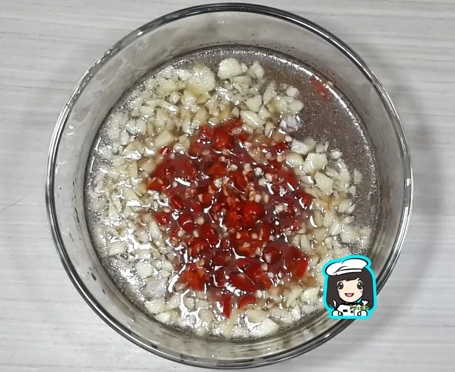 3.ตักน้ำที่ออกจากการนึ่งปลา มาทำเป็นน้ำราด ผสมกับน้ำตาลทราย น้ำปลา ซีอิ้วขาว น้ำมะนาว ผงปรุงรส คนทุกอย่างให้ละลาย ใส่พริก กระเทียมสับ ชิมรสตามชอบ