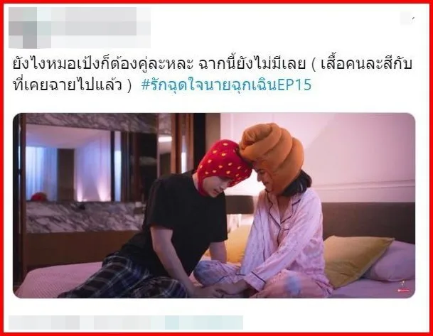 โดยบอกว่า "ยังไงหมอเป้งก็ต้องคู่ละหละ ฉากนี้ยังไม่มีเลย ( เสื้อคนละสีกับที่เคยฉายไปแล้ว ) #รักฉุดใจนายฉุกเฉินEP15" และหลายคนยังบอกอีกว่า "ยังมีเห็นฉากจูบกำแพงเลย" งานนี้ทีมหมอเป้งเตรียมฟินแน่นอน