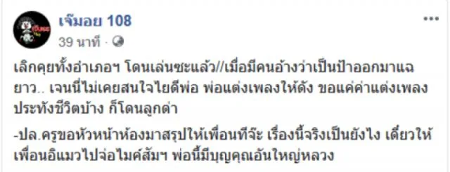 จากกรณีเจดังอย่าง เจ๊มอย 108 ได้ออกมาโพสต์เลิกคุยทั้งอำเภอฯ โดนเล่นซะแล้ว เมื่อมีคนอ้างว่าเป็นป้าออกมาแฉยาว เจนนี่ไม่เคยสนใจไยดีพ่อ พ่อแต่งเพลงให้ดัง ขอแค่ค่าแต่งเพลงประทังชีวิตบ้าง ก็โดนลูกด่า ปล.ครูขอหัวหน้าห้องมาสรุปให้เพื่อนทีจ๊ะ เรื่องนี้จริงเป็นยังไง เดี๋ยวให้เพื่อนอิแมวไปจ่อไมค์สัมฯ พ่อนี้มีบุญคุณอันใหญ่หลวง