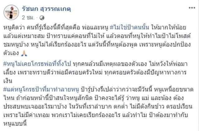 หนูไม่เคยโกรธพ่อที่ทิ้งไป ทุกคนล้วนมีเหตุผลของตัวเอง ไม่หวังให้พ่อมาเลี้ยง เพราะทราบดีว่าพ่อมีครอบครัวใหม่ ทุกครอบครัวต้องมีปัญหาทางการเงินแต่หนูโกรธป้าที่มาทำลายหนู ป้ารู้บ้างรึเปล่าว่ากว่าจะมีวันนี้ หนูเหนื่อยขนาดไหน ถ้าก่อนหน้านี้ป้าสนใจหนูสักนิด ป้าคงจะได้รู้ ว่าหนู แม่ และน้อง ต้องประสบพบเจออะไรมาบ้าง ในวันที่เราลำบาก ตกต่ำ ไม่มีตังกินข้าว ดรอปเรียนเพราะไม่มีค่าเทอม พวกเราไม่เคยเรียกร้องอะไร แล้วทำไม ป้าต้องมาทำกับหนูแบบนี้