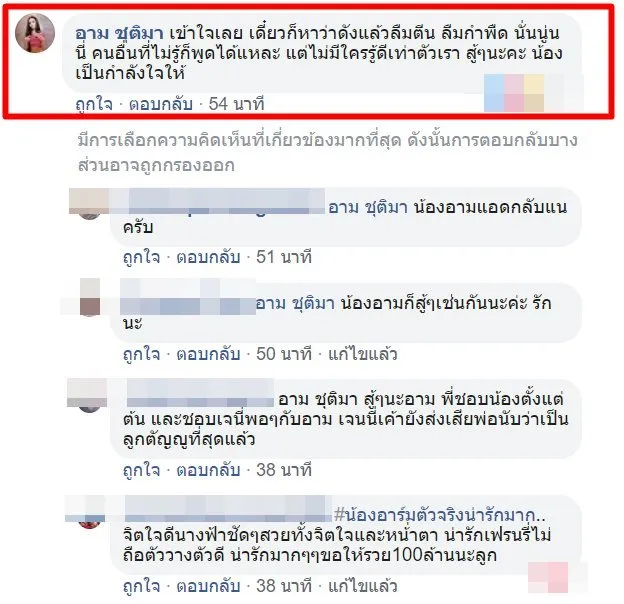 ล่าสุด อาม ชุติมา ได้เข้ามาคอมเมนต์ถึง เจนนี่ ได้หมดถ้าสดชื่น แล้วจ้า โดยให้กำลังใจนักร้องรุ่นน้องไว้ว่า "เข้าใจเลย เดี๋ยวก็หาว่าดังแล้วลืมตีน ลืมกำพืด นั่นนู่นนี่ คนอื่นที่ไม่รู้ก็พูดได้แหละ แต่ไม่มีใครรู้ดีเท่าตัวเรา สู้ๆนะคะ น้องเป็นกำลังใจให้"