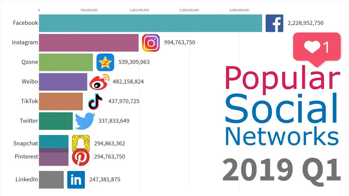 นักศึกษาระดับปริญญาเอก ปีที่ 1 ได้เก็บข้อมูลการใช้ Social Networks จากทั่วโลก ระหว่างปี 2003-2019 เป็นรายเดือน แล้วจัดทำเป็นกราฟความเคลื่อนไหวในความนิยมการใช้ Social Networks เป็นราย 3 เดือน เพื่อเปรียบเทียบความนิยมในการใช้ และนี่คือวิวัฒนาการในช่วงเวลาดังกล่าว มาดูความเปลี่ยนแปลงกันว่าโปรแกรมไหนได้รับความนิยมมากที่สุด