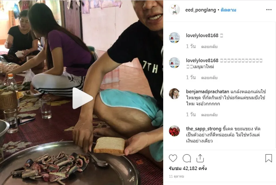 จากกรณีที่ อิ๊ด โปงลางสะออน ได้โชว์เปิบพิศดารกินแซนวิชใส้งูแบบดิบๆ โดยได้โพสต์คลิปการกินแซนวิชใส้งูลงอินสตาแกรม พร้อมบอกว่า วันนี้จะมาทำแซนด์วิชสูตรชาวกาฬสินธุ์ ซึ่ง อี๊ด ได้ใช้ขนมปัง 1 แผ่น ตักเนื้องูสดๆ หั่นเป็นท่อนๆ วางบนแผ่นขนมปัง จากนั้นห่อแล้วกัดกินแบบสดๆ ซึ่งแฟนๆ และหลายคนที่ติดตามต่างเข้ามาคอมเมนต์ถามกันเป็นจำนวนมากถึงเรื่องรสชาติ และบางคนยังบอกอีกว่า ชาวกาฬสินธุ์ไม่ได้กินอาหารแบบนี้ อีกทั้งยังห่วงเรื่องสุขอนามัยอีกด้วย เพราะงูไม่น่าจะกินแบบสดๆ ได้