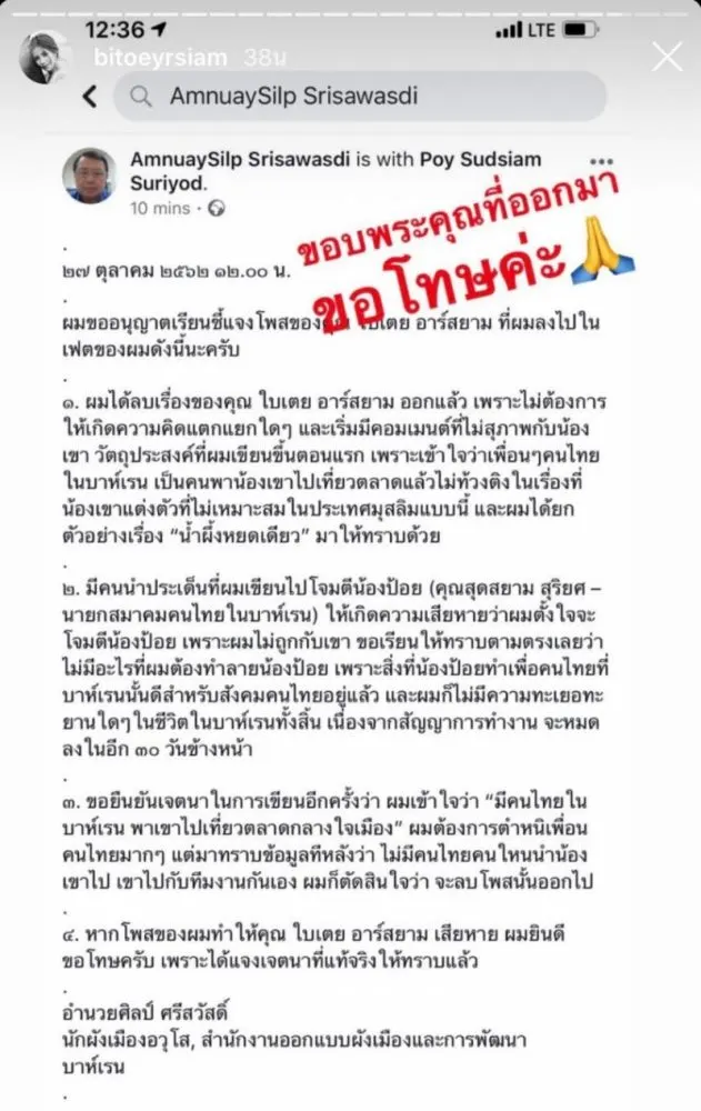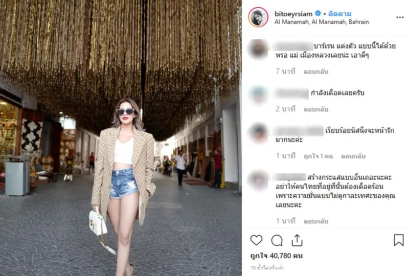 ใบเตย โพสต์แล้ว หลังมีดราม่า ใส่ชุดไม่ให้เกียรติ ประเทศบาห์เรน