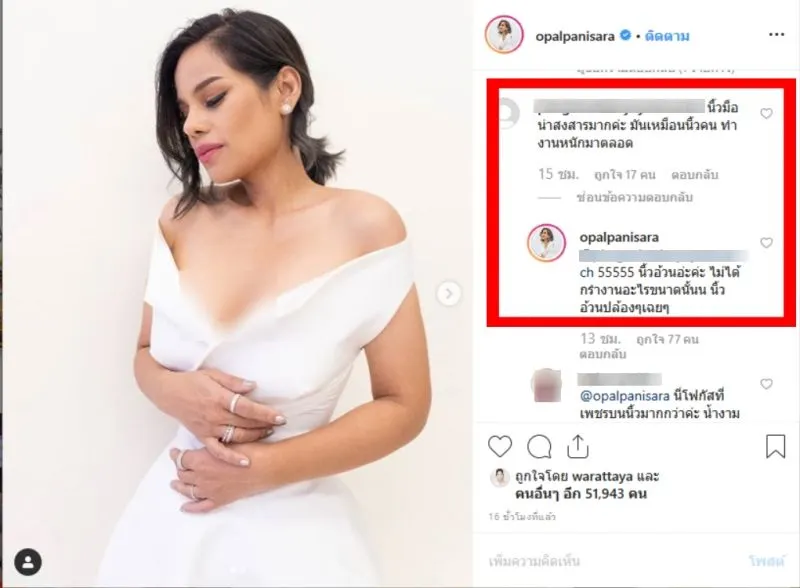 ส่วนชาวเน็ตคนอื่นก็ได้เเสดงความคิดเห็นเข้าข้าง โอปอล์ ว่า นิ้วบ่งบอกว่าเจ้าของทำงานหนักทำงานเก่งเลยมีแหวนใส่ คำโพสต์ก็บ่งบอกนิสัยคนเช่นกัน