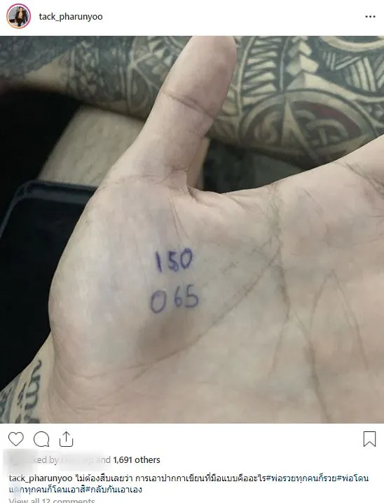 ล่าสุด (30 ต.ค.) หนุ่มแทค โชว์เลขเด็ดบนฝามือที่จดไว้ด้วยปากกา คือเลข 150 และ 065 พร้อมกับเขียนแคปชั่นว่า "ไม่ต้องสืบเลยว่า การเอาปากกาเขียนที่มือแบบคืออะไร#พ่อรวยทุกคนก็รวย#พ่อโดนแ-กทุกคนก็โดนเอาสิ#กลับกันเอาเอง"