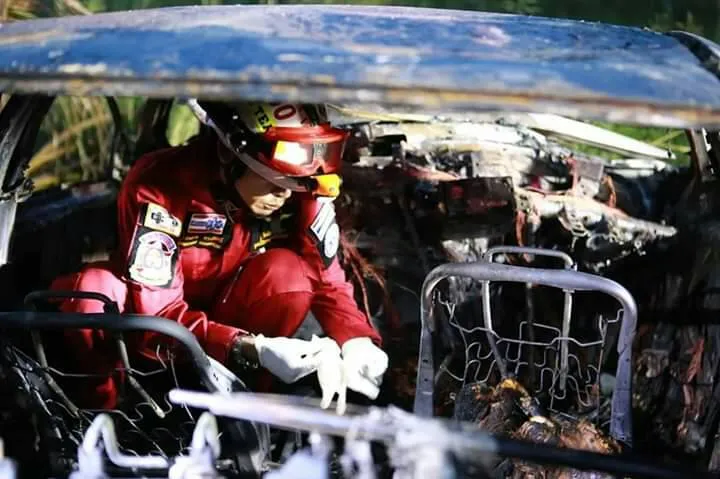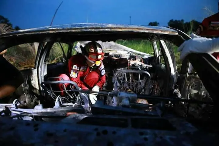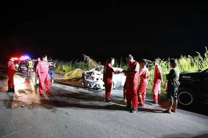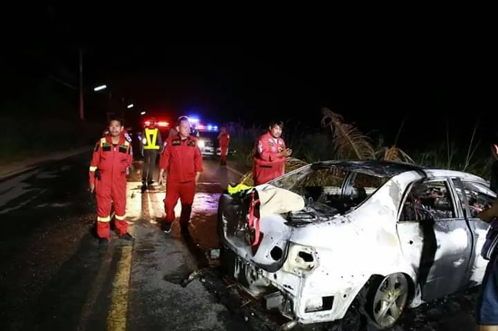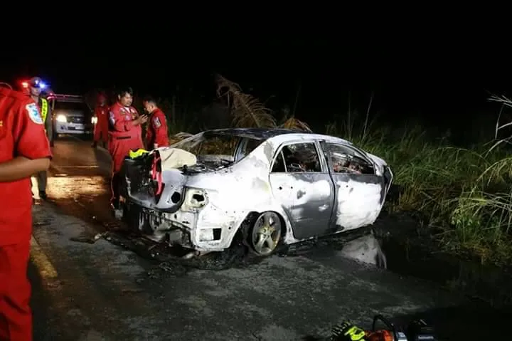 ....ที่เกิดเหตุพบรถเก๋ง โตโยต้าอัลตีส หมายเลขทะเบียน ขท 1189 ชลบุรี ชนกับต้นมะพร้าวไฟกำลังไหม้อย่างรุนแรง ทีมกู้ภัยเร่งประสานรถดับเพลิงมาฉีดน้ำ ใช้เวลาประมาน 15 นาทีจึงดับไฟไว้ได้ ตรวจสอบภายในรถพบศพผู้เสียชีวิต 1 รายเป็นชายทราบชื่อต่อมาคือนาย ภัทรพล นที อายุ 23 ปี สภาพไหม้เกรียมเสียชีวิตในที่เกิดเหตุ