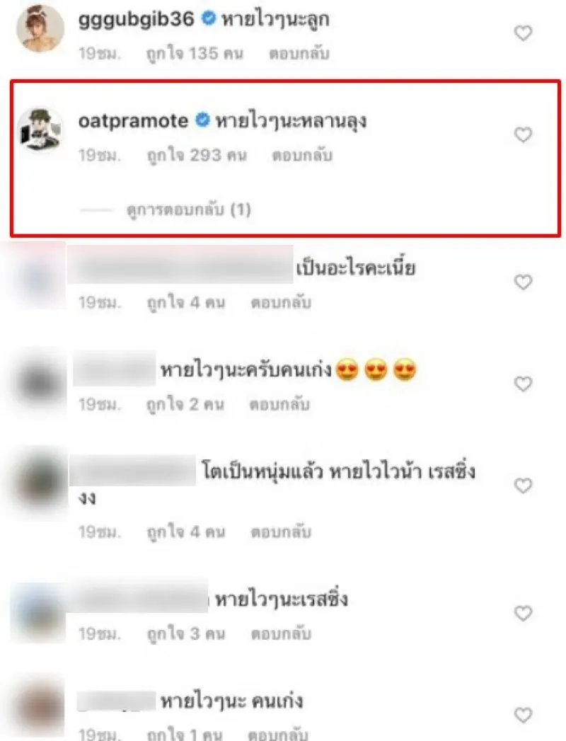 ซึ่งหลังจากที่สาวแพทโพสต์ หนุ่มโอ๊ต ก็เข้ามาคอมเมนต์อย่างเร็วว่า “หายไวๆนะหลานลุง” ทำเอาเหล่าบรรดาแฟนคลับเข้าไปกดไลค์กันเพียบเลยทีเดียว