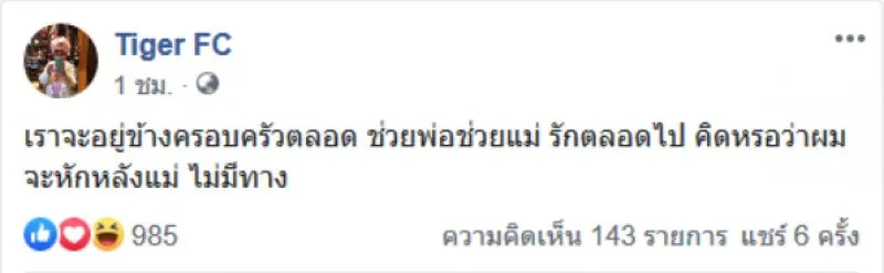 ล่าสุด เพจTiger FC ซึ่งเป็นเพจของไทเกอร์ ก็ได้โพสต์ข้อความระบุว่า เราจะอยู่ข้างครอบครัวตลอด ช่วยพ่อช่วยแม่ รักตลอดไป คิดหรอว่าผมจะหักหลังแม่ ไม่มีทาง