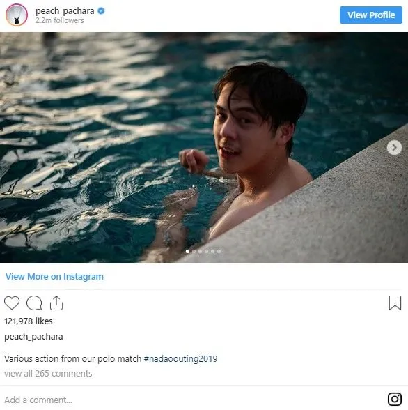 ล่าสุด หนุ่มพีช ได้เพิ่มความฟินให้กับสาวๆ โดยการออกมาโพสต์รูปของตัวเองและทีมเพื่อนนาดาวบางกอก ที่กำลังอวดความแซ่บกันอยู่กลางสระน้ำ แถมงานนี้ยังเห็นกล้ามหน้าท้องแน่นๆกันแบบชัดเจนมาก โดยหนุ่มพีชได้ระบุแคปชั่นเอาไว้ว่า “Various action from our polo match #naaoouting2019” งานนี้หนุ่มพีชนั้นทำเอาสาวๆ ใจเต้นไม่เป็นจังหวะเลยค่าาาา