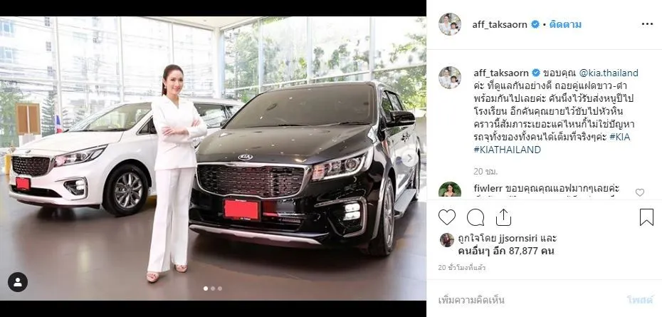 “ขอบคุณ @kia.thailand ค่ะ ที่ดูแลกันอย่างดี ถอยคู่แฝดขาว-ดำพร้อมกันไปเลยค่ะ คันนึงไว้รับส่งหนูปีไปโรงเรียน อีกคันคุณยายไว้ขับไปหัวหิน คราวนี้สัมภาระเยอะแค่ไหนก็้ไม่ใช่ปัญหา รถจุทั้งของทั้งคนได้เต็มที่จริงๆค่ะ #KIA #KIATHAILAND”