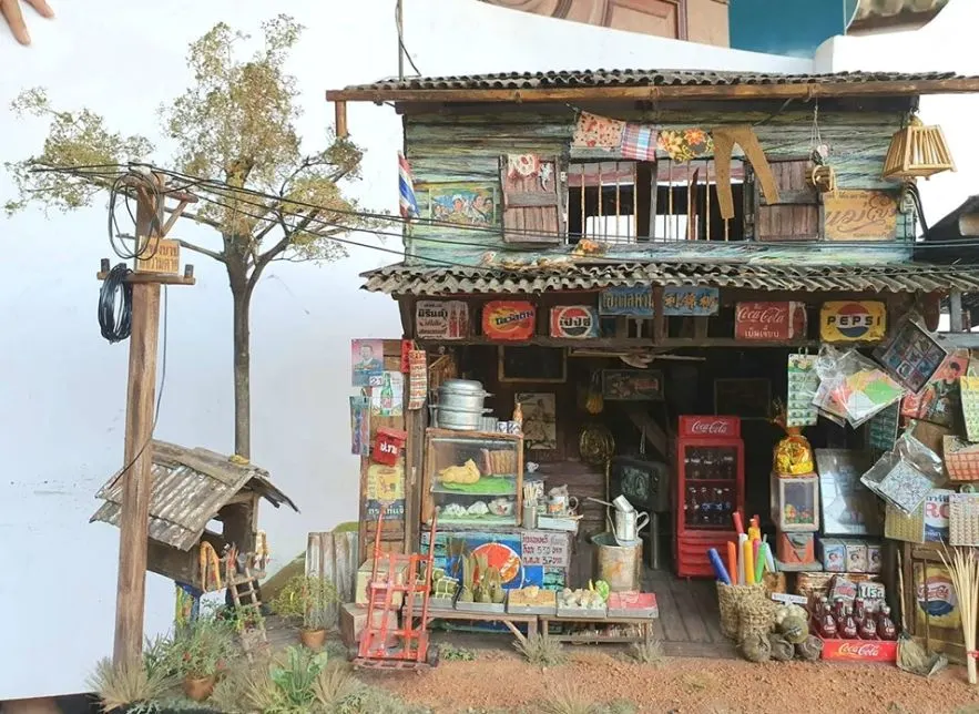 แบบโมเดลการจำลองบ้านที่เป็นร้านค้าโบราณ ซึ่งถ้าหากใครที่เกิดในยุคนั้นที่ที่ต้องการไปมากที่สุดคือตลาด ร้านค้า ร้านขายของ ซึ่งเมื่อเราได้เข้าไปในตลาดเราจะพบกับร้านค้าที่ขายทุกสิ่งทุกอย่างไม่ว่าจะเป็น เครื่องดื่ม อาหาร ขนม ของใช้ เช่นในภาพนี้ ทำให้นึกถึงความเป็นสมัยก่อนเลย