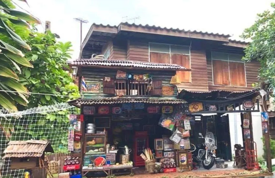นี่ก็เป็นร้านค้าที่มีลักษณะการจัดร้านที่มีความแตกต่างกัน แต่ของที่ร้านค้าขายในร้านก็จะคล้ายๆกัน สมัยก่อนจะนิยมสร้างบ้านไม้ 2 ชั้น โดยบ้านจะมีการต่อชายคาออกมาเพื่อบังแดดบังฝน ส่วนชั้นบนของบ้านหลังนี้จะมีประตูและมีระเบียงที่สามารถเดินออกมาหน้าบ้านได้