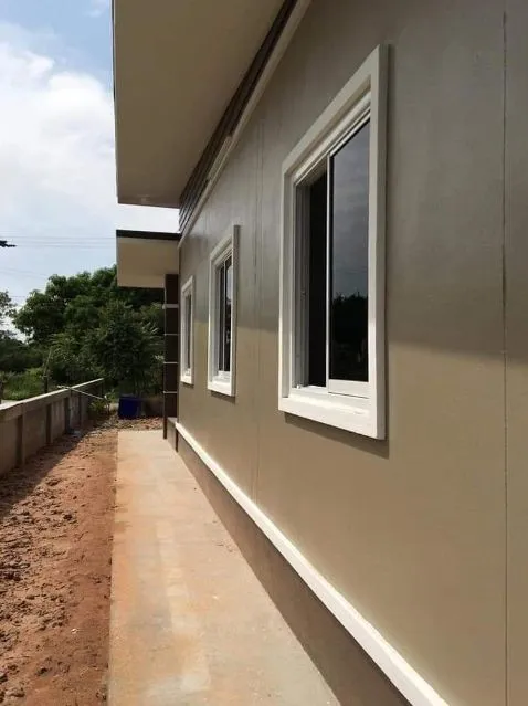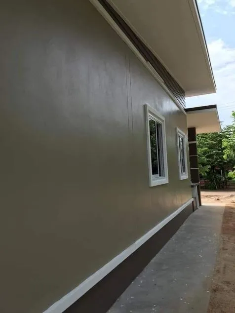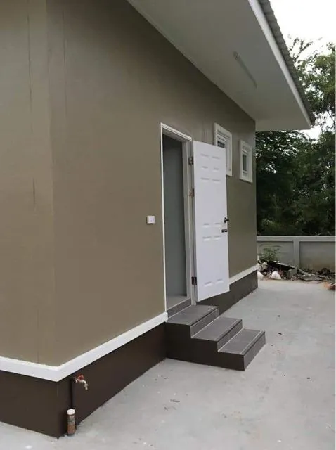 ด้านข้างของบ้านมีกระจกบานเลื่อนสองบาน ฐานของบ้านทางด้วยสีน้ำตาลเข้มถัดขึนไปทาสีขาวและผนังบ้านทาด้วยสีน้ำตาลสวยงาม บริเวณพื้นที่ว่างข้างบ้านสามารถปลูกต้นไม้ที่สามารถให้ร่มเงาแก่บ้านได้ ทำให้บ้านเย็น
