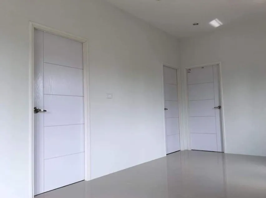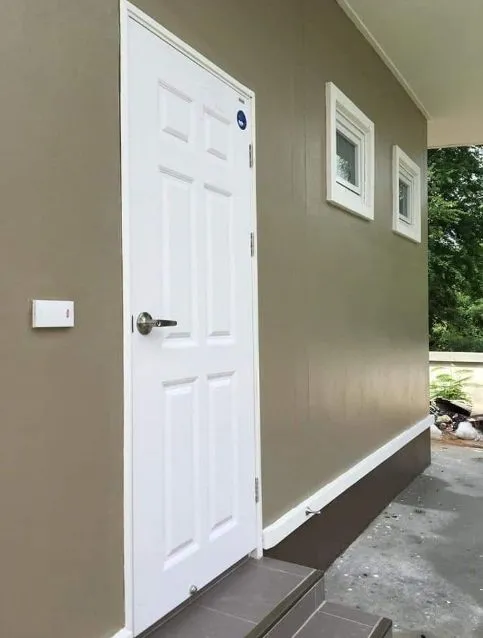 ข้างหลังบ้านมีประตูหนึ่งบานทาด้วยสีขาวที่สามารถเปิดเข้าออกจากภายในบ้านไปนอกบ้าน