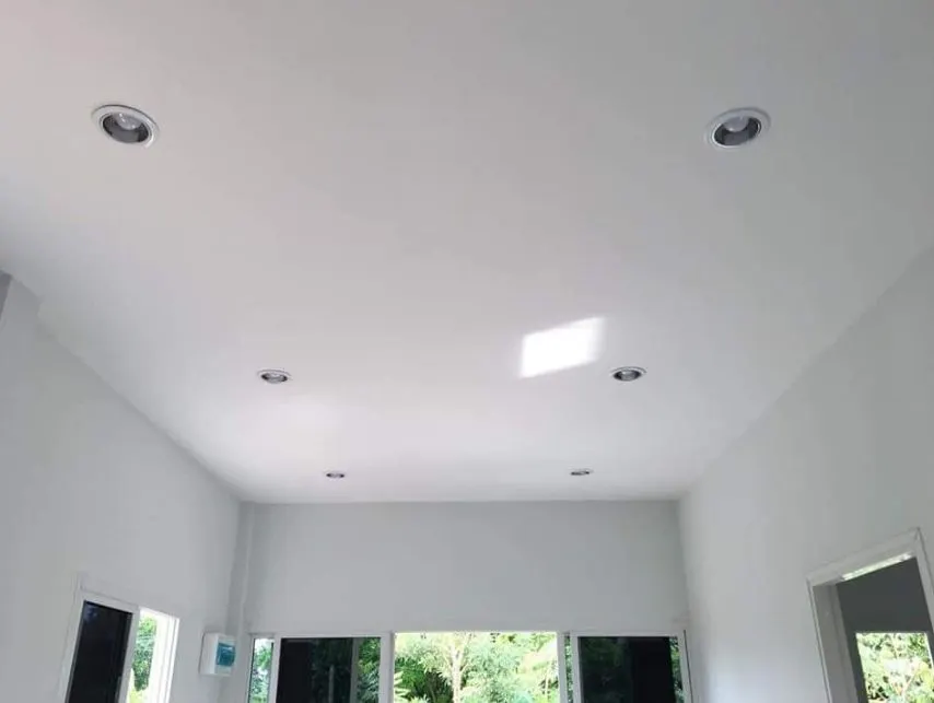 ฝ้าเพดานเป็นฝ้าแบบเรียบทาด้วยสีขาว มีไฟหลุมเพื่อส่องสว่างให้แก่บ้าน
