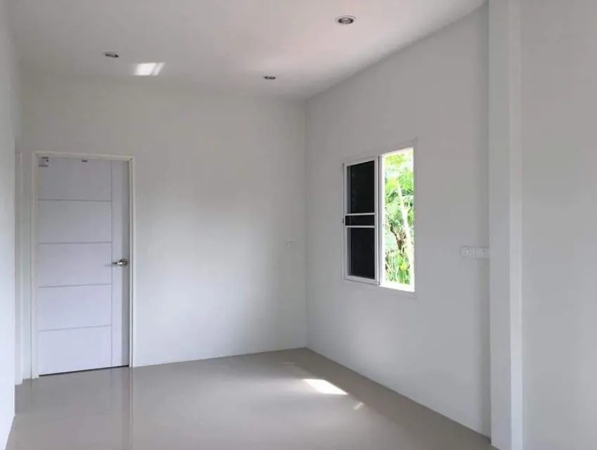 ภายในบ้านผนังทาด้วยสีขาว ที่ประตูและหน้าต่างมีมุ้งลวด พื้นปูด้วยกระเบื้องสีขาวครีมสะอาดตา