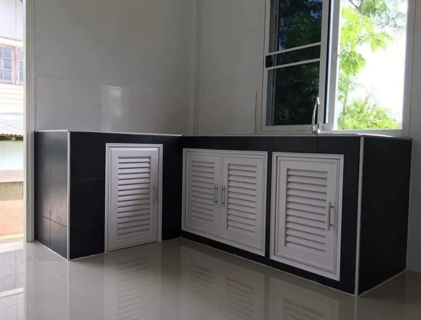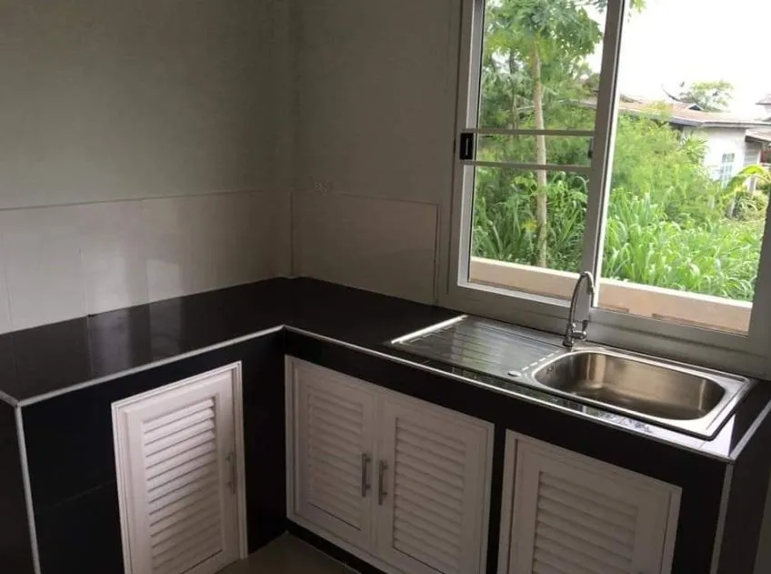 ภายในห้องครัวมีเคาท์เตอร์สำหรับวางของปูพื้นด้วยกระเบื้องสีดำ มีประตูบานเล็กสีขาวใต้เคาท์เตอร์สำหรับเก็บอุปกรณ์เครื่องใช้ บนเคาท์เตอร์จำมีซิ้งค์สำหรับล้างจานและมีหน้าต่างบานเลื่อนติดมุ้งลวดบานใหญ่สำหรับเปิดเพื่อถ่ายเทอากาศ