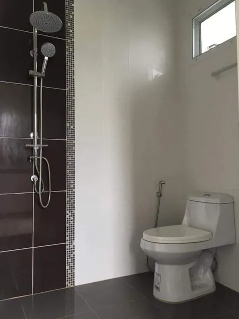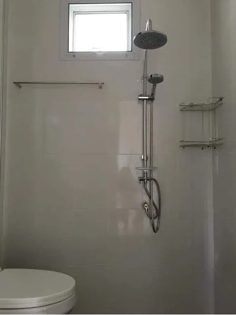 มีฝักบัวสำหรับยืนอาบน้ำ มีราวเหล็กไว้แขวนเสื้อผ้า มีที่สำหรับวางสบู่ ยาสีฟัน แปรงสีฟัน มีกระจกบานเล็กระบายอากาศ