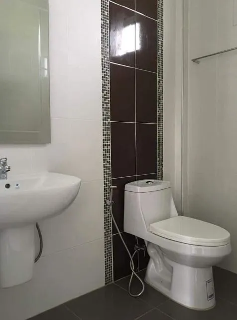 ในส่วนของห้องน้ำ พื้นปูด้วยกระเบื้องสีเทาเข้ม ผนังห้องน้ำปูด้วยกระเบื้องสีขาวและสีน้ำตาลขั้นด้วยกระเบื้องลายสี่เหลี่ยม มีช่องหน้าต่างบานเล็กระบายอากาศ