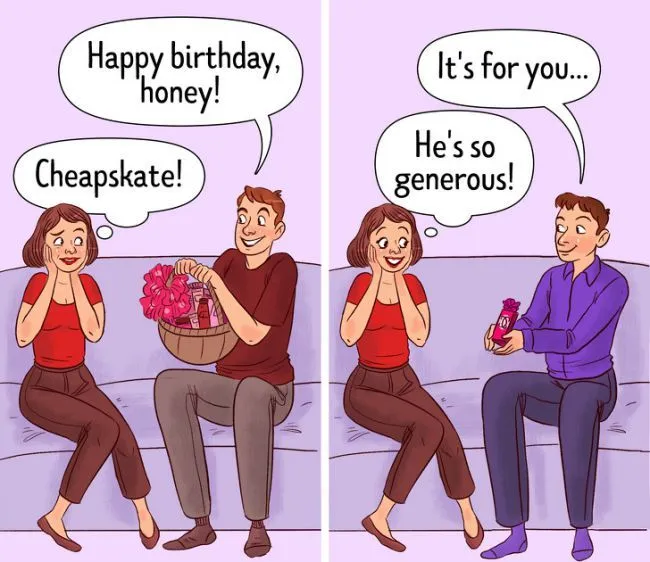(ซ้าย: ชาย – สุขสันต์วันเกิดจ้ะ ที่รัก / หญิง- ขี้เหนียวจัง ขวา: ชาย – นี่สำหรับคุณ หญิง – เขาใจกว้างจัง)