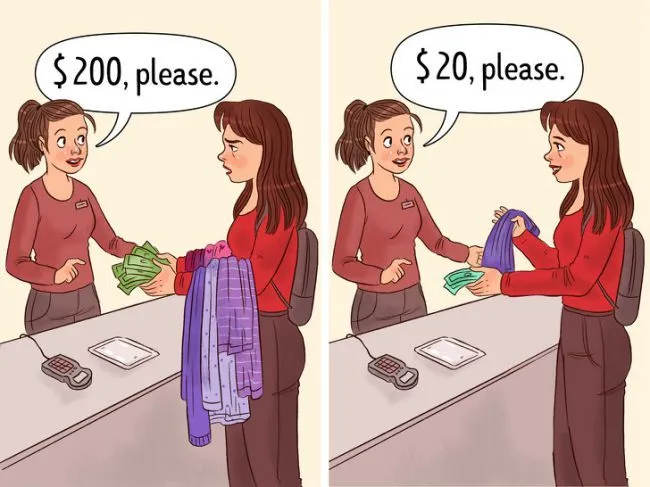เราติดป้ายว่า ผ้าพันคอราคาแพง ($ 45) กับเสื้อโค้ทราคาถูก ($ 55) แล้วให้ผู้เข้าทดสอบเลือกสินค้า 1 อย่าง