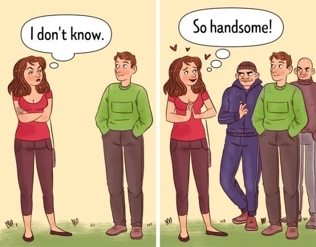 (ซ้าย: ฉันไม่รู้สิ ขวา: หล่ออะไรอย่างนี้)