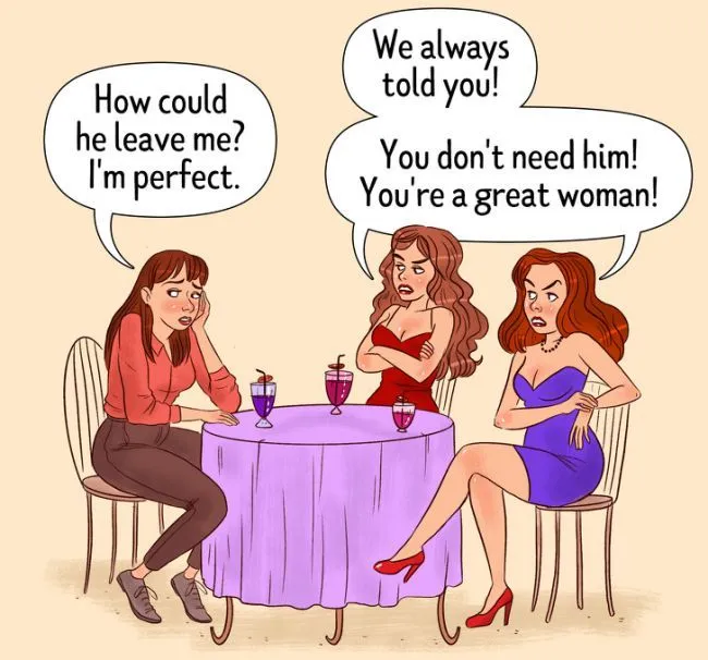 ดังนั้นผู้หญิงที่พูดเรื่องที่เธอเลิกกับแฟนกับเพื่อนของเธอ อาจใช้คำพูดของเพื่อนๆ (เช่น“ คุณดูดีและเค้าไม่คู่ควร” หรือ“ คุณทำสิ่งที่ถูกต้อง”) เพื่อเป็นข้อโต้แย้งที่จะไม่ยอมรับความผิดพลาดของเธอเอง