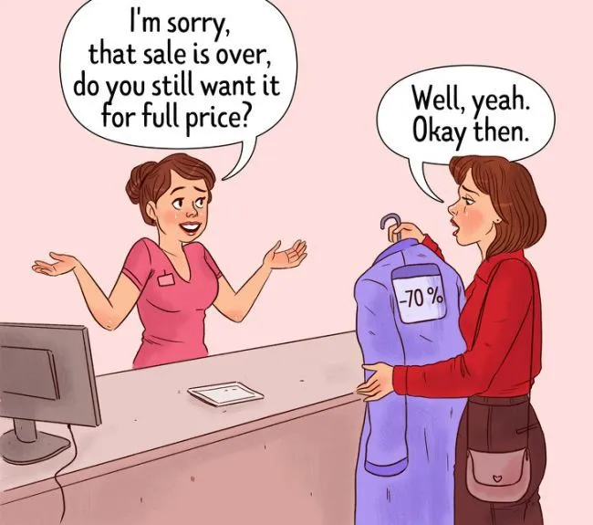 (ซ้าย: ฉันขอโทษค่ะ รายการลดราคาหมดไปแล้ว คุณต้องการชุดนี้ในราคาเต็มไหมคะ