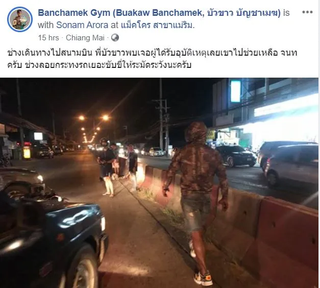 เหตุเกิดเมื่อคืนของวันที่ 10 พ.ย. 62 ที่ผ่านมา ทางเพจBanchamek Gym (Buakaw Banchamek, บัวขาว บัญชาเมฆ) ได้เผยภาพเหตุการณ์ขณะที่ บัวขาว ได้เห็นรถจักรยานยนต์ชนกับรถยนต์ ทำให้มีชายคนขับรถจักรยานยนต์ได้รับบาดเจ็บ โดยหลังจากทางเจ้าตัวเห็นเหตุการณ์ดังนั้นก็ไม่รอช้า รีบเข้าไปช่วยเหลือชายที่บาดเจ็บ