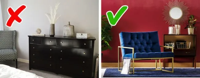 หากห้องไม่ใหญ่และเพดานไม่สูงมากให้หาเฟอร์นิเจอร์ที่มีสีเดียวกับผนัง เคล็ดลับนี้จะทำให้รู้สึกเหมือนมีที่ว่างมากมาย โดยเฉพาะถ้าคุณเน้นจำนวนชิ้นส่วนของเฟอร์นิเจอร์ตามภาพด้านขวา