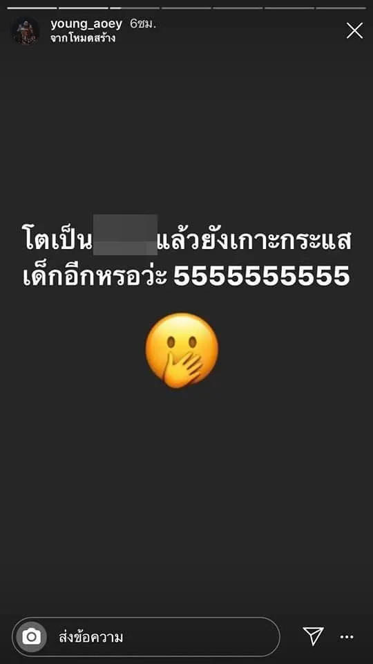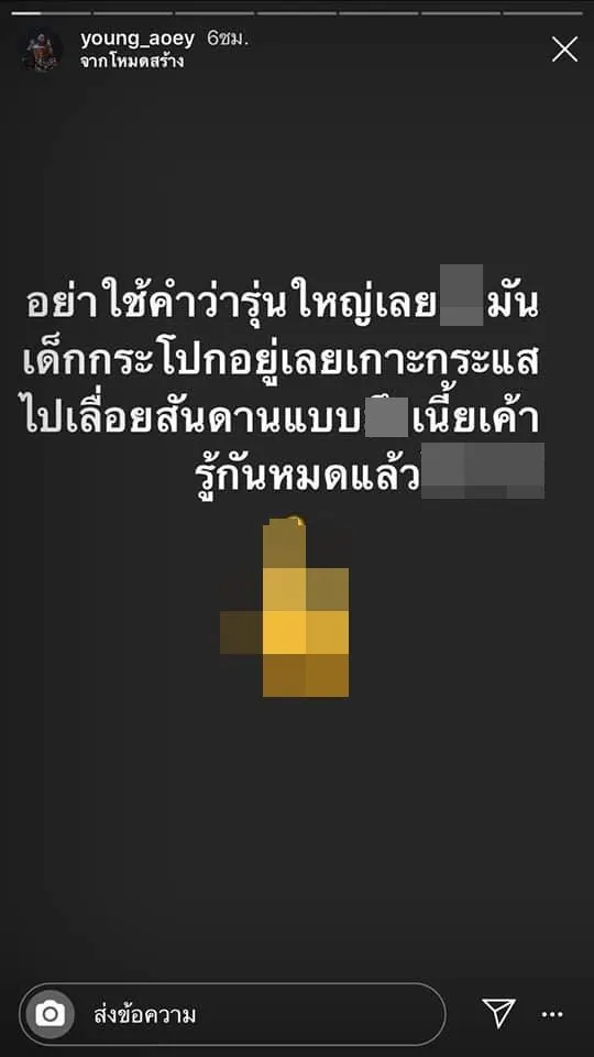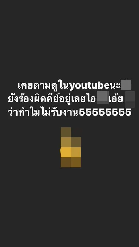 โดยโพสต์ได้ระบุข้อความว่า ” โตเป็นคXายแล้วยังมาเกาะกระแสเด็กอีกเหรอ”, “อยากเล่นเพลง รัก xxxที่สุดในโลกมากเลยครับ”, “เคยตามดูใน youtube นะ ยังร้องผิดคีย์เลย ก็ว่าทำไมไม่รับงาน” และ “อย่าใช้คำว่ารุ่นใหญ่เลย Xึงมันเด็ก…อยู่เลย เกาะกระแสไปเรื่อย สันดานแบบ…เนี่ย เขารู้กันหมดแล้ว ไอ้…” ทำเอางานนี้หลายคนแอบสงสัยไม่ได้ ว่าเจ้าตัวหมายถึงใครกันแน่