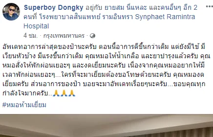 จากนั้นลูกชายของน้าโย่ง ก็ได้อัพเดทอาการว่า “อัพเดทอาการล่าสุดของป๋านะครับ ตอนนี้อาการดีขึ้นกว่าเดิม แต่ยังมีไข้ มีเวียนหัวบ้าง มีแรงขึ้นกว่าเดิม คุณหมอให้น้ำเกลือ และยาบำรุงแล้วครับ คุณหมอสั่งให้พักผ่อนเยอะๆ และงดเยี่ยมนะครับ เนื่องจากคุณหมออยากให้มีเวลาพักผ่อนเยอะๆ…ใครที่จะมาเยี่ยมต้องขอโทษด้วยนะครับ คุณหมองดเยี่ยมครับ ส่วนอาการของป๋า บอยจะมาอัพเดทเรื่อยๆนะครับ…ขอบคุณทุกกำลังใจมากครับ #หมอห้ามเยี่ยม ”