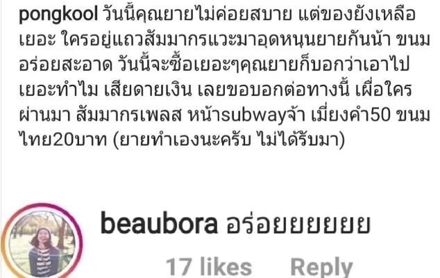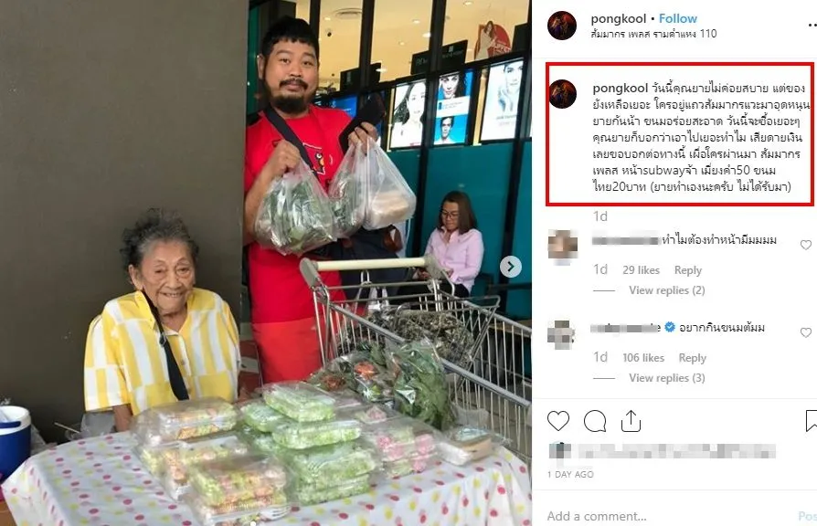 ล่าสุดก็ไปโผล่คอมเมนต์ในอินสตาแกรมของ “ป็อป ปองกูล” อดีตคนรักที่แชร์ภาพให้ช่วยอุดหนุนคุณยายขายขนมข้างทาง พร้อมแคปชั่นว่า “วันนี้คุณยายไม่ค่อยสบาย แต่ของยังเหลือเยอะ ใครอยู่แถวสัมมากรแวะมาอุดหนุนยายกันน้า ขนมอร่อยสะอาด วันนี้จะซื้อเยอะๆคุณยายก็บอกว่าเอาไปเยอะทำไม เสียดายเงิน เลยขอบอกต่อทางนี้ เผื่อใครผ่านมา สัมมากรเพลส หน้าsubwayจ้า เมี่ยงคำ50 ขนมไทย20บาท (ยายทำเองนะครับ ไม่ได้รับมา)”